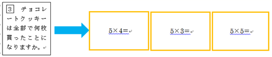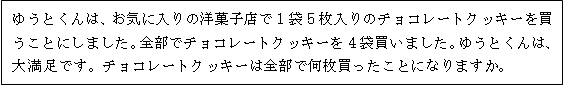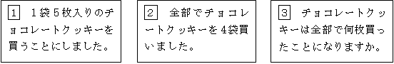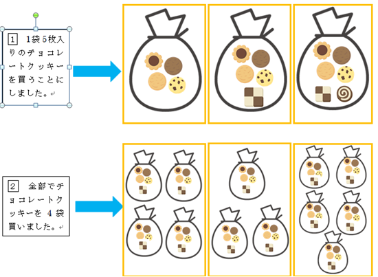 支援方法・・・問題文をいくつかに分け、それぞれの文章に対応する絵カードを選んでもらい立式することで、視覚的に数の大小を理解できるように工夫をして、ワーキングメモリを補いながら学習する。