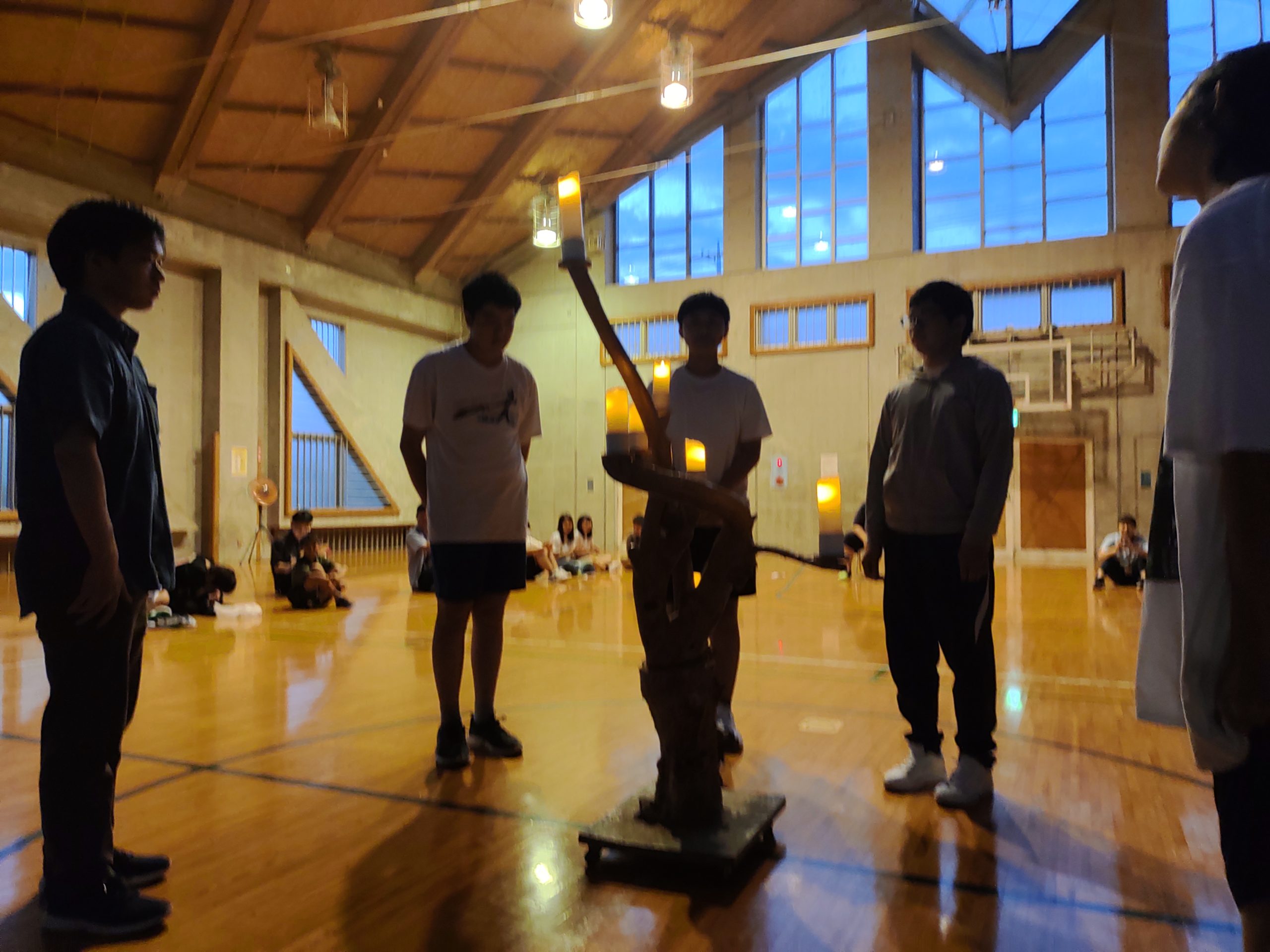 1日目夕食後には、キャンドルファイアーを行いました。光を灯したキャンドルが集まった光景はとても綺麗でした。その光を囲みながら2つのゲームを楽しみ、最後には「少年時代」の合唱をしました。光があることによって、どれだけ私たちの生活が支えられているかを改めて感じる機会にもなったのではないでしょうか