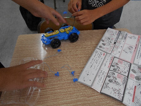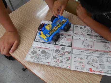 理科の授業では、人間の五感についての話を受け、五感のいずれかが欠けるとどのようなことが起こるのかを体験しました。また、実験キットを使ってモーターカーを走らせました。直列つなぎと並列つなぎでは、モーターカーの速度が変わることに気付いた上で、新品の電池が2個あった時に直列つなぎ、並列つなぎのどちらで走らせるのがよいか考えました。「車のスピードを出したいから直列つなぎのほうがいい」「長く走らせたいから並列つなぎのほうがいい」などという意見が出ました。