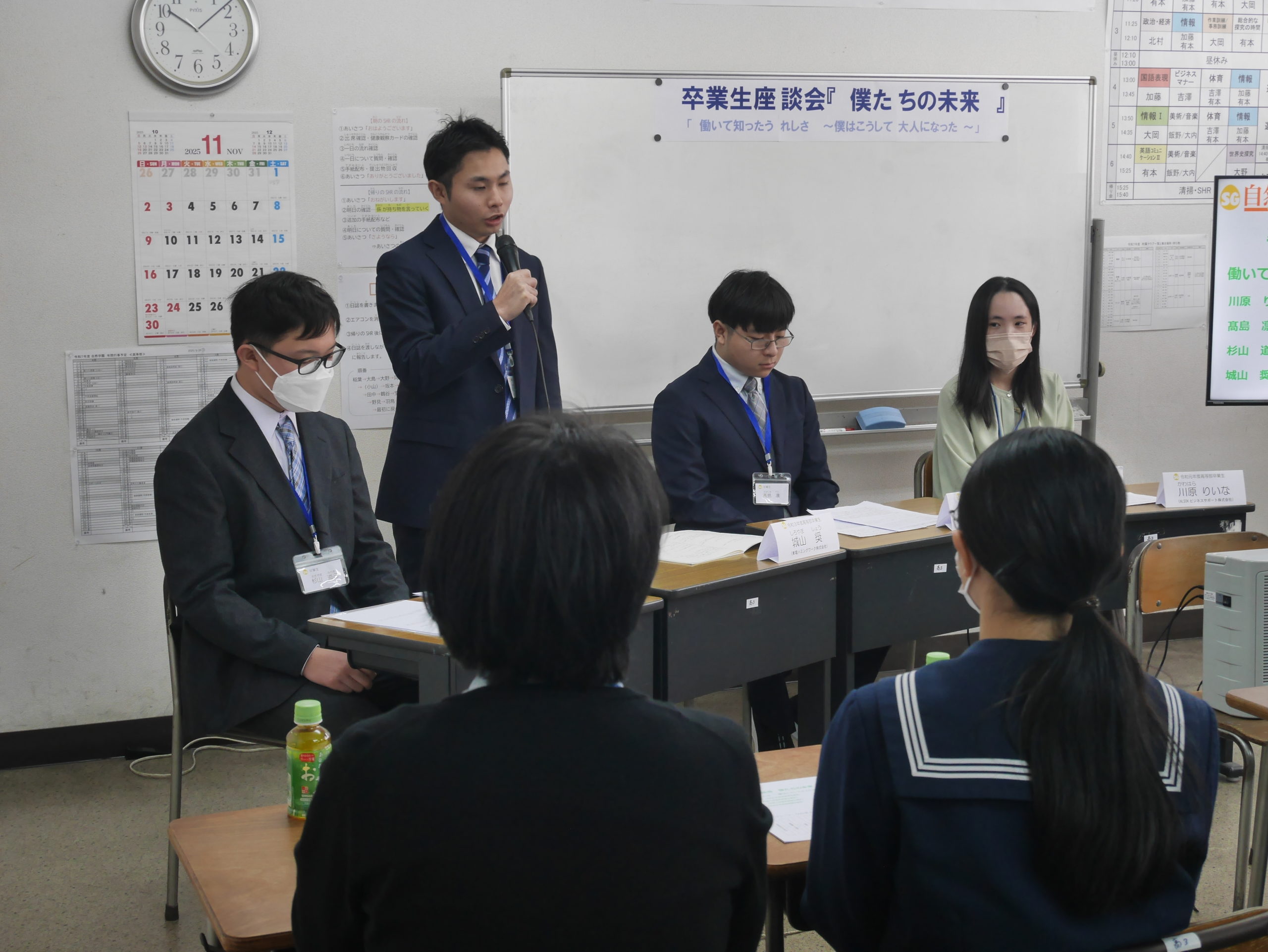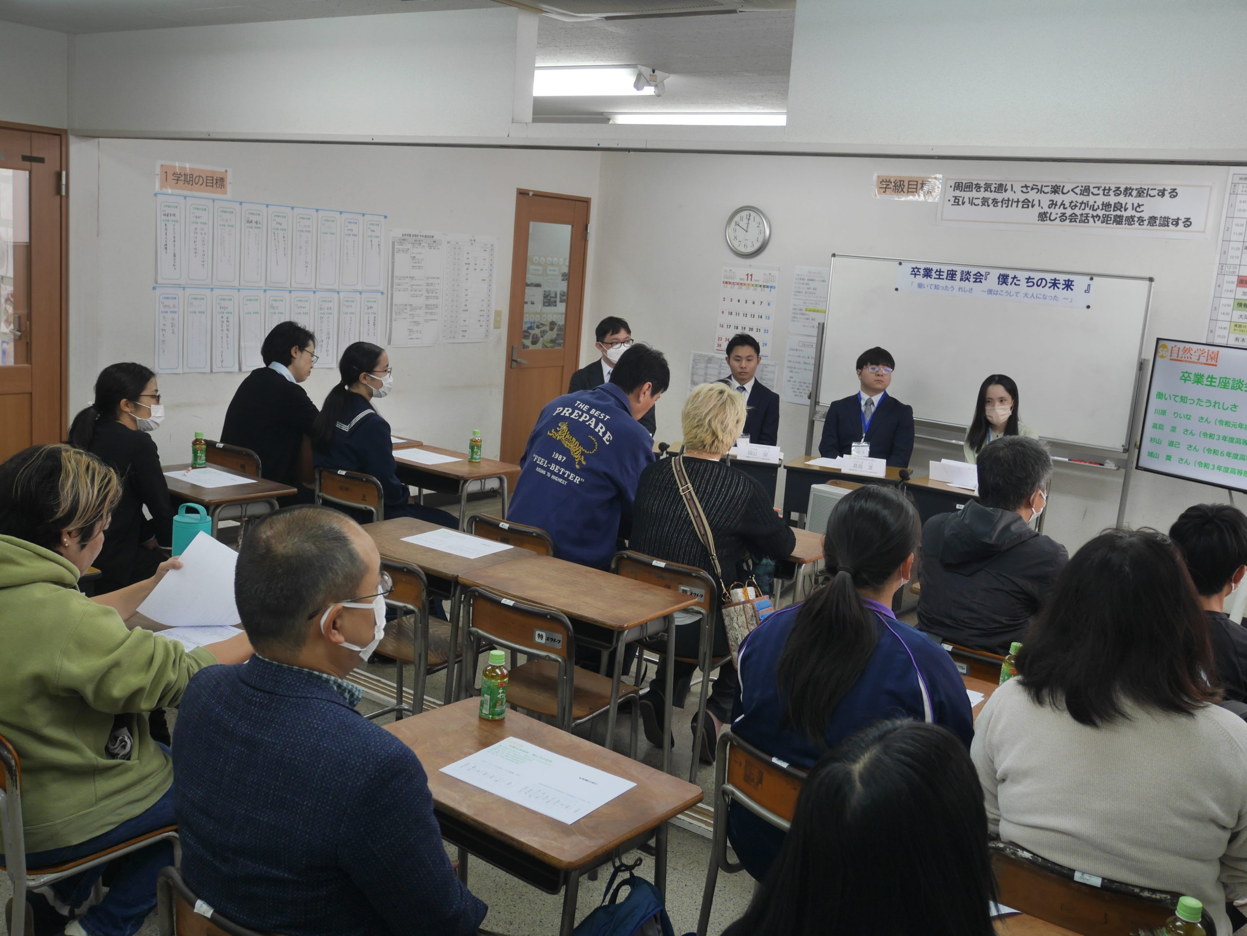 第1日目は生徒たちによる模擬店と生徒による作品展示、各部活の活動展示が公開され、保護者をはじめ、ご家族の方々、卒業生などを中心に多くの皆様方で校舎は賑わいを見せていました。10時より特別企画の卒業生座談会「僕たちの未来」を通じて、社会に参加して懸命に生きる卒業生の思いを継承できればとの思いで企画しました。卒業生と同じように発達のつまずきがあり現在の学校に適応できず生きづらさ抱えている保護者の皆さんやお子様方に少しでも勇気を与え、今後の就労に向けて意欲や希望をもてる座談会になることを期待してこの取り組みを始めました。