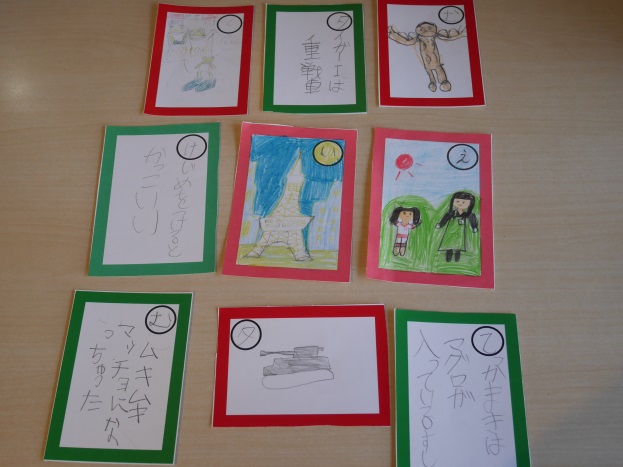 1月17日(金)、小学部では新年最初の行事として、「かるた取り大会」を開催いたしました。当日を迎える前に、みんなで担当文字の「読み札」の文章を一生懸命考え、「絵札」に色を塗ってかるたを完成させていきました。「ムキムキ マッチョになっちゃった」「鉄火巻 まぐろの入った おすしです」など、自由でユニークな「絵札」が出揃い、大会を盛り上げていました。
