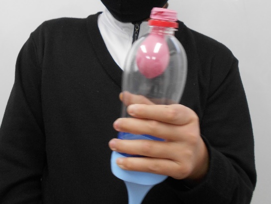 ペットボトルに風船をつける作業に戸惑いましたが、参加者全員が、実験装置を完成することができ、肺は横隔膜の動きで大きくなったり小さくなったりするというしくみを確認することができました。